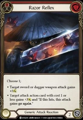 I’ve mentioned Reactions a few times in this article, lets take a look at one card that we’ve seen from our hand example, Razor Reflex (Red):