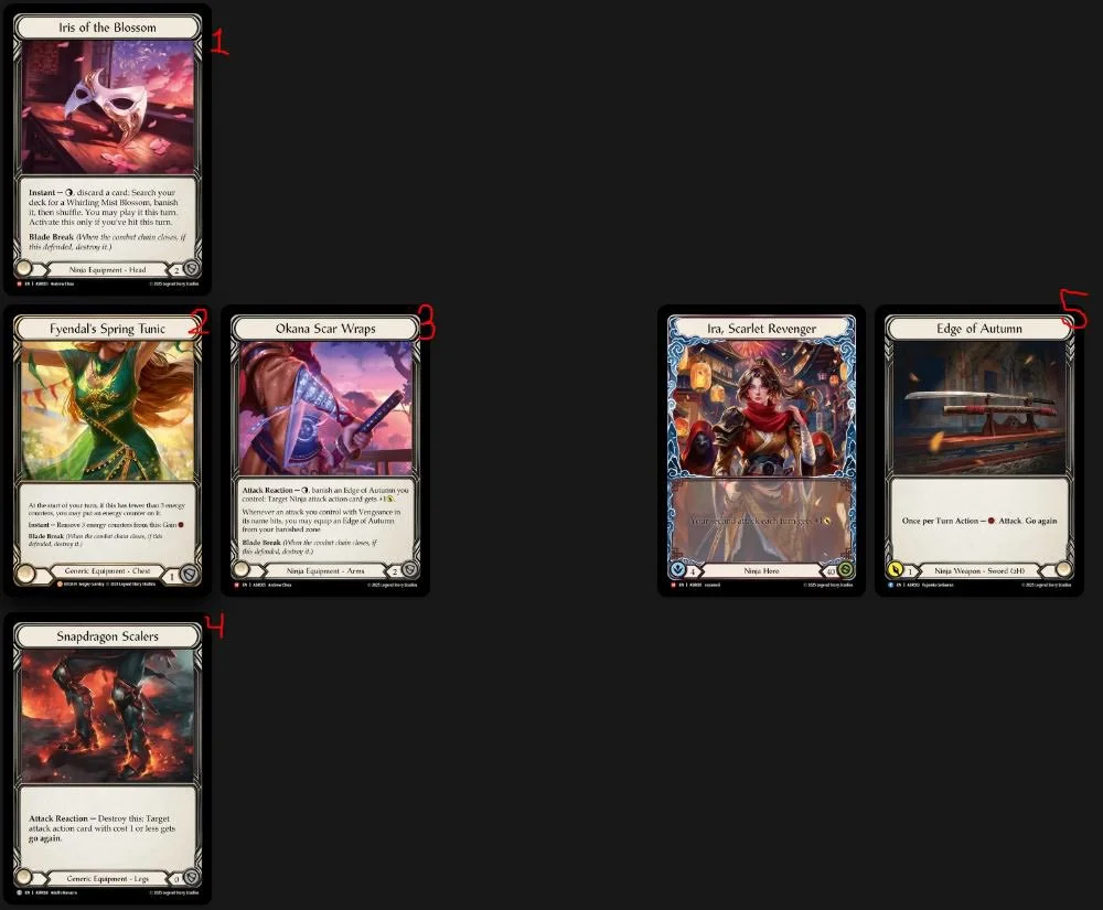 Equipment will start on the board and from this we are starting out the game at our strongest state. Some equipment is best used Offensively and some is best used Defensively, but when should we use them? Let’s take a look at my Ira Decklist Equipment Suite below and how we present them on the table as we play: