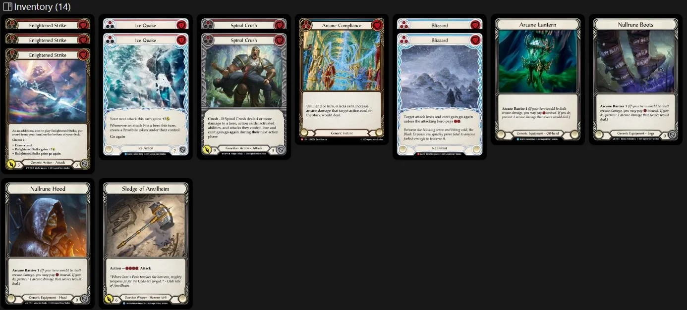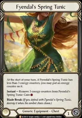 Fyendal’s Spring Tunic: This was one of the first pieces I invested in for Flesh and Blood for its versaility in MANY decks. Yes it was a big purchase, but this card is just too good. Initially, we were running the Armory Deck provided Tectonic Crust, but I gradually crafted my decklist to be more ice focused and rendered this far less use. Theres MANY important points of use in your matches for Jarl that we get to see awesome power from this card.