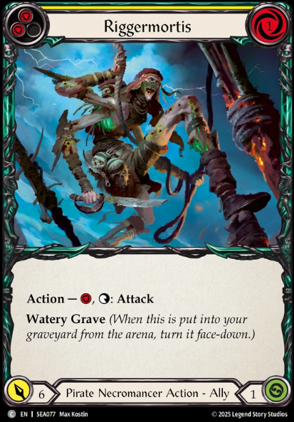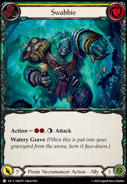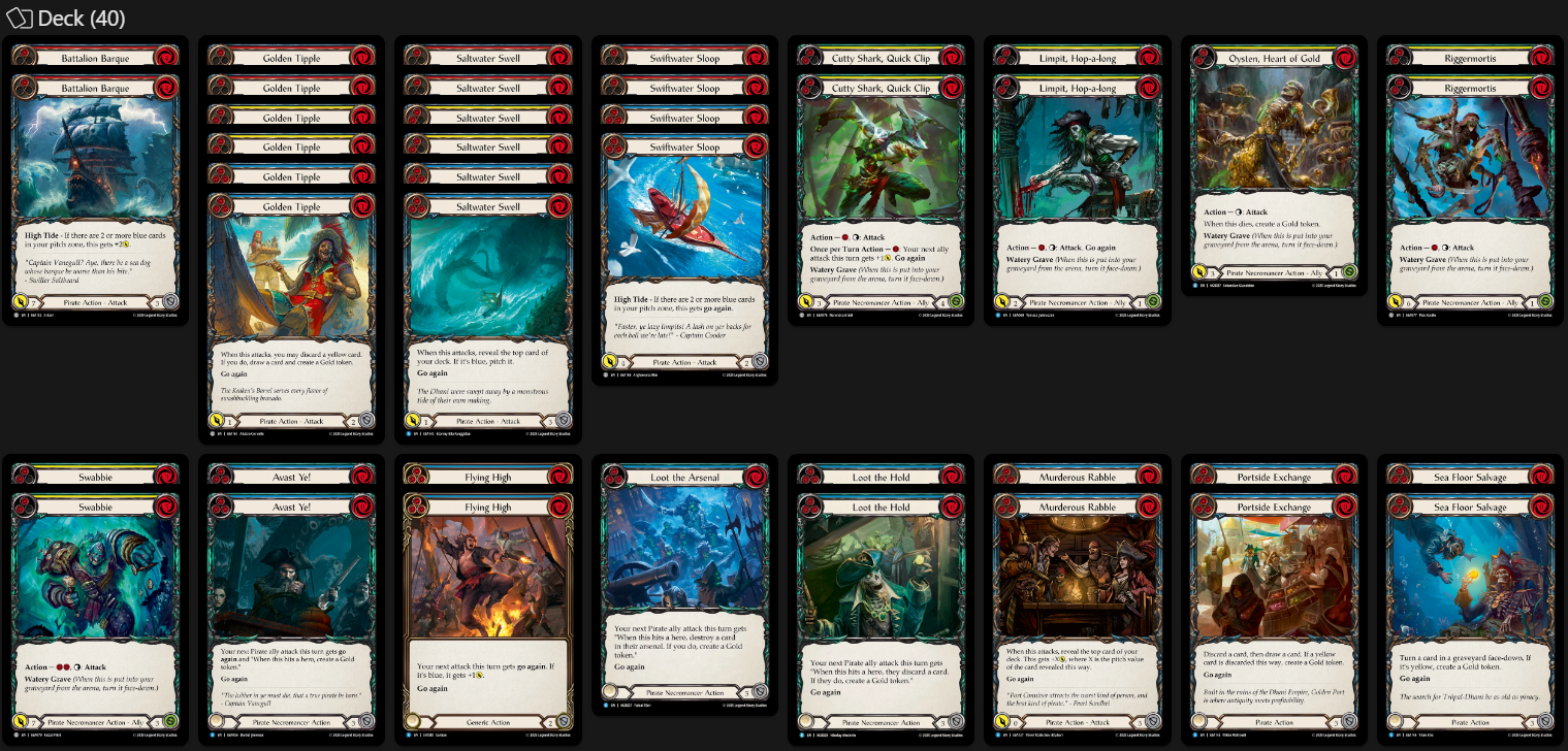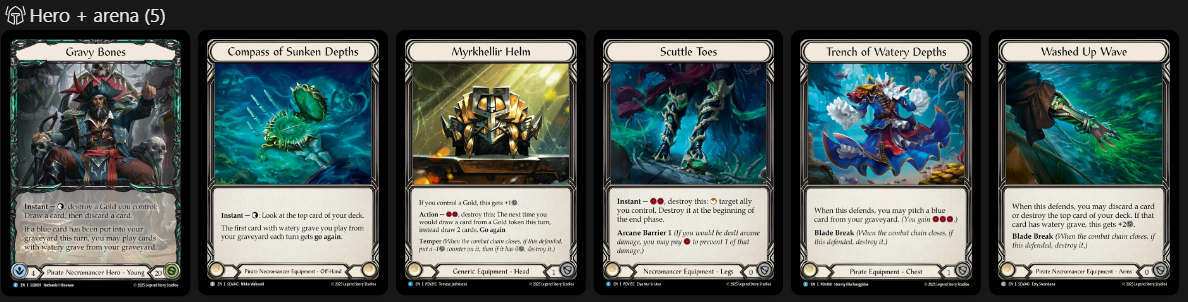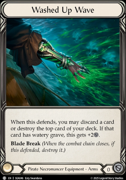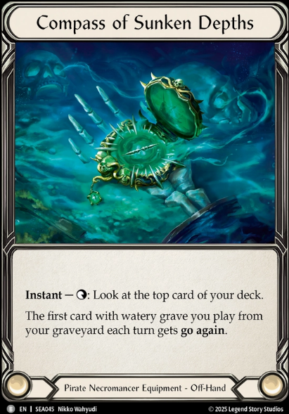 Finally, we have our most important piece of Equipment, our Off-Hand Compass of Sunken Depths. This allows us to be good and playable and as a Jarl main, this thing has to get the metaphorical Hammer always. Anyways, my apologies, I was reminescing… Tap look at top card of deck and then first card with watery grave you play from Graveyard each turn has go again. When to Tap? I would say its equal parts when needing to calculate blocks and equal parts when you need to confirm a Saltwater Swell pitch extension. Being able to confirm a blue on top for Swell to extend hands is very important and if this gets your Sloops or Barques online thats great to know ahead of time to understand what your cracking back with, OR if theres a blue on top to be able to get a couple allies out of graveyard, etc. Personally I like tapping to look before blocks.