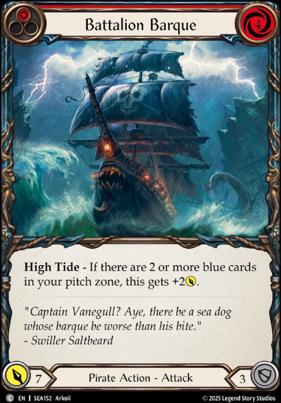 I recently ran into some decks and players that are great at playing against Gravy and are good at blocking and clearing board states with a weapon hit, or have access to go again on their side of the board. Battalion Barque is here to help compensate and push damage through. Theres been games when if the opponent managed the board state effectively we were running out of gas, this applies pressure and can help us clear out opponents hands and potentially keep allies on board longer, while also being a finisher. Next, lets talk about our Ally suite.