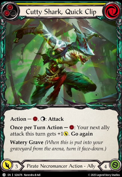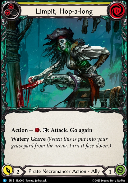 Cutty Shark: 1 Cost, 3 Attack, 4 Butt Shark Man! Typically he has not been very impotant, but in Sage he has a home. Being a 4 butt is kind of impotant in this format and will require some of the stronger cards in decks to deal with him, or multiple go agains. Also he can pump his own attack should you have an inefficient turn with pitch that needs to be used, OR if you need to get 2 blues in pitch, dont forget to use his ability to maybe tick down to one and pitch another blue to swing a barque or sloop if needed. Now lets get to Limpit