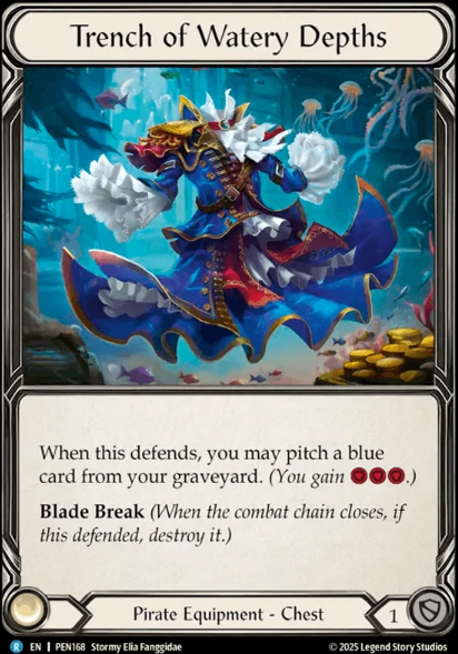 And the final New piece of equipment we get is the Trench of Watery Depths. This is also a pretty cool card as it achieves two things for us….ok 3 things. It blocks for 1, cool. When it defends you pitch a blue from graveyard and this right here is achieving two things. One, its getting us pitch on our opponents turn, this is really only useful for us when we have to pay for AB, typically runechants when they decide to go wide and 2 it helps slightly against fatigue. I’m still not certain if this needs to be a sideboard card, but for now its main deck.