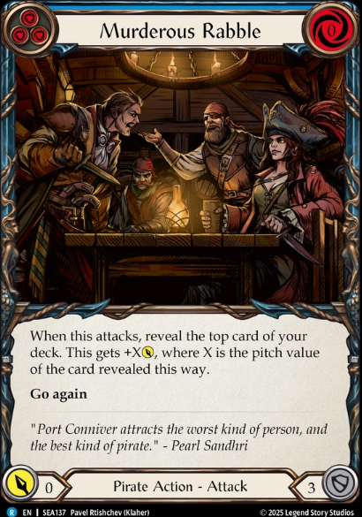 Murderous Rabble is best used when we know we have a Blue on top of Deck after a Compass, but also it gets us into our Graveyard to pull out some minons while delivering a little damage too possibly, regardless of whats ontop of deck, just swing, let it resolve and hit graveyard, then go to town with your allies. Next is Portside Exchange