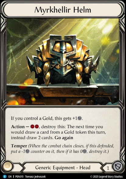 First off we have Myrkhellir Helm and this card from at least an Art perspective doesnt fit Gravy Bones, but playability is through the roof. This card has facilitated some WIDE! and Aggressive Turns for me, im talking maybe 4 or 5 attacks wide with swiftwater sloops, battalion barque and some limpits to go at someone for 20+ damage in a turn. Not only does this give us Aggressive Greedy lines to chase, it also has temper to give us a nice free block early when we have a gold in play. The opportunity to run this line happens quite often too, I would say if we ever have the Saltwater Swell with a Swiftwater Sloop in Arsenal or in hand and we compass a Blue on top, your good to potentially go for it. If we pitch a blue and Swell the blue on top we have 5 left in pitch, meaning we pop the helm, pop a gold with 1 pitch remaining and we are more than likely going to be hitting more blues to get going wide AND have Sloops and Barques now active too. Another thing to mention here that the Helm will NOT trigger if we use Gravy Bones ability to destroy the gold and draw. The Helm only works when we pay to pop the gold ourselves, which isnt the end of the world.