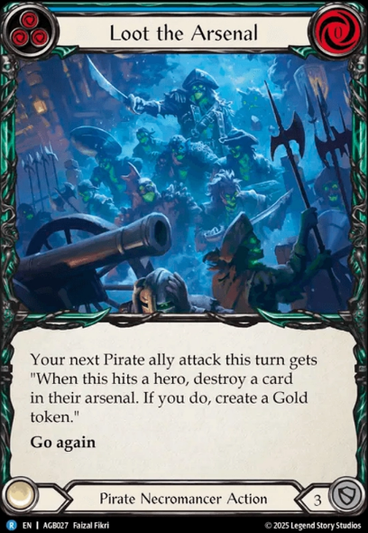 Avast Ye! and Flying High I think are our best Blue cards personally. We can take full advantage of these when our Graveyard has targets (other than Limpit) and we have the ability to cast them and swing with them. We do this by playing Avast Ye! or Flying High, allowing it to resolve then hit our Graveyard, thus activating Gravy Bones. Then we will cast the ally we want and swing with them because that first attack will have go again now. From the beginning of that play line we can either play another ally somewhere from either hand or Graveyard to build a board state, or sloop to go wider and or end with a big Barque. Up next is our current one-of here in blue with Loot the Arsenal.